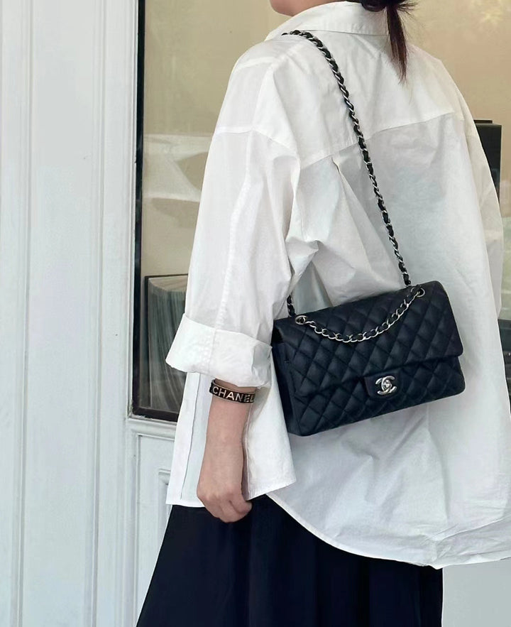- Color: Black leather, silver hardware