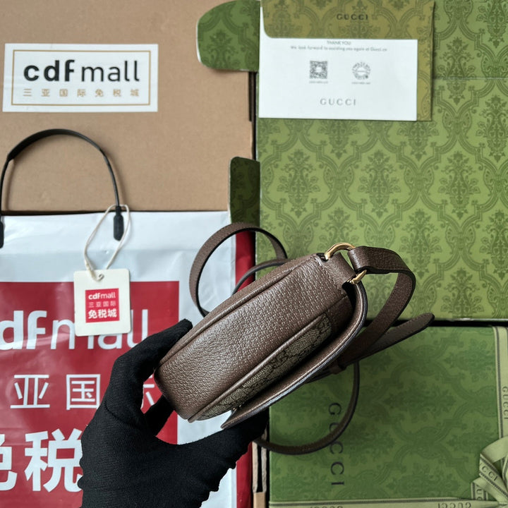 OPHIDIA MINI SHOULDER BAG 20 WITH WEB IN BEIGE EBONY CANVAS MIX BROWN CALFSKIN