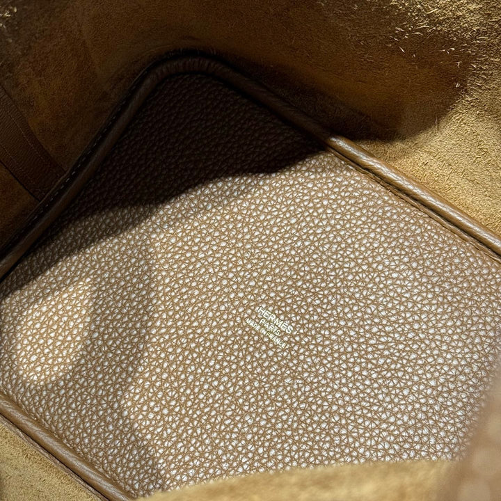 HERMES 25S PICOTIN LOCK 22 IN BURNT CARAMEL CALFSKIN GOLD HARDWARE